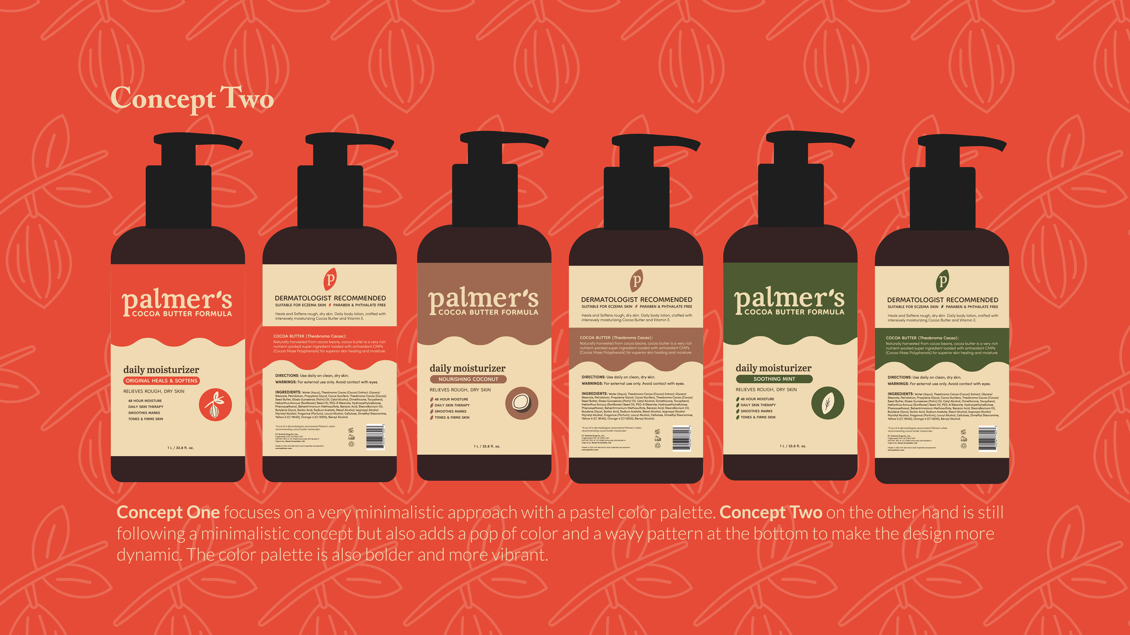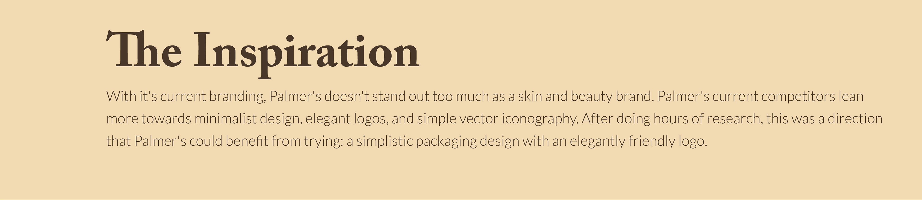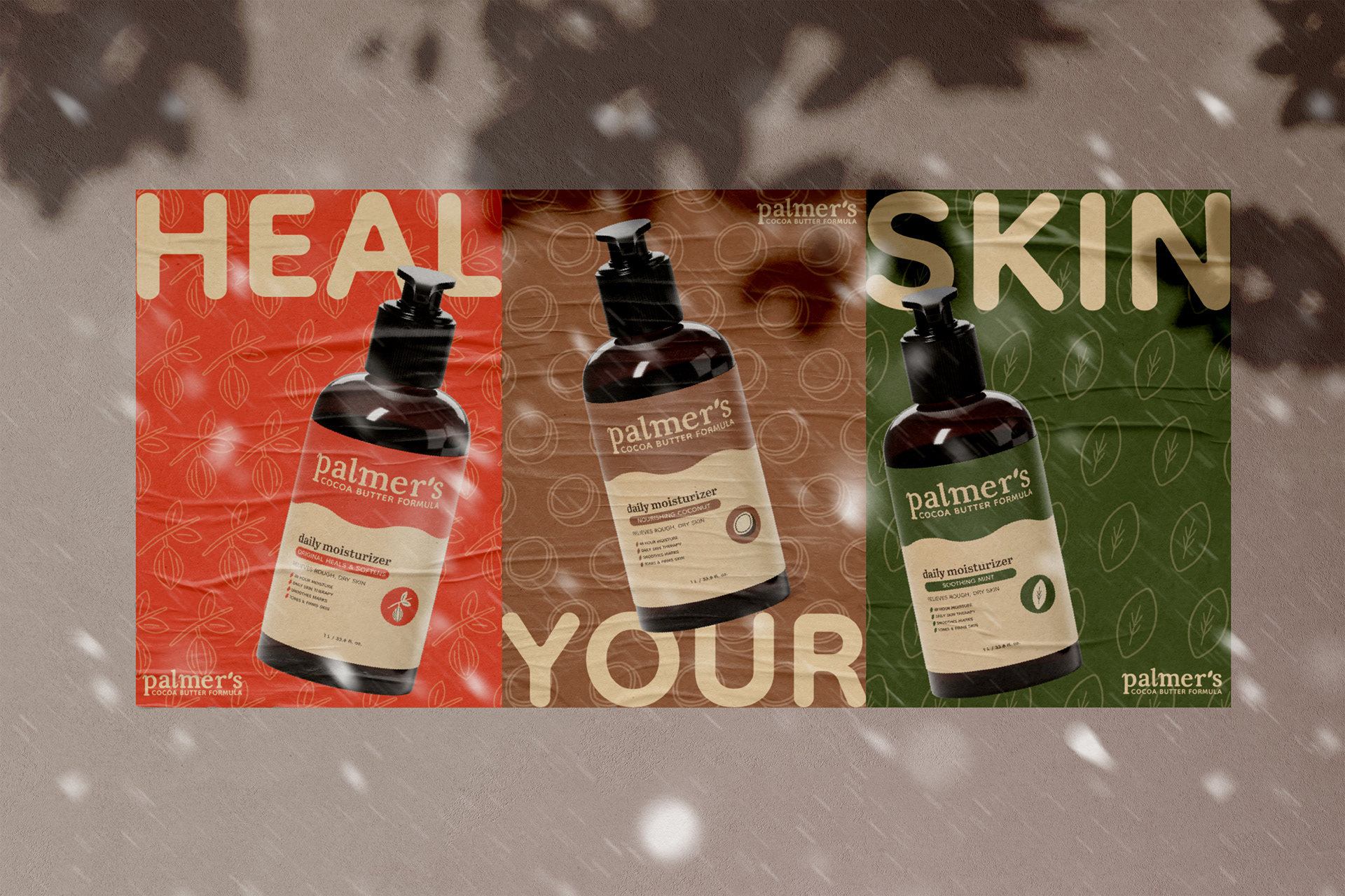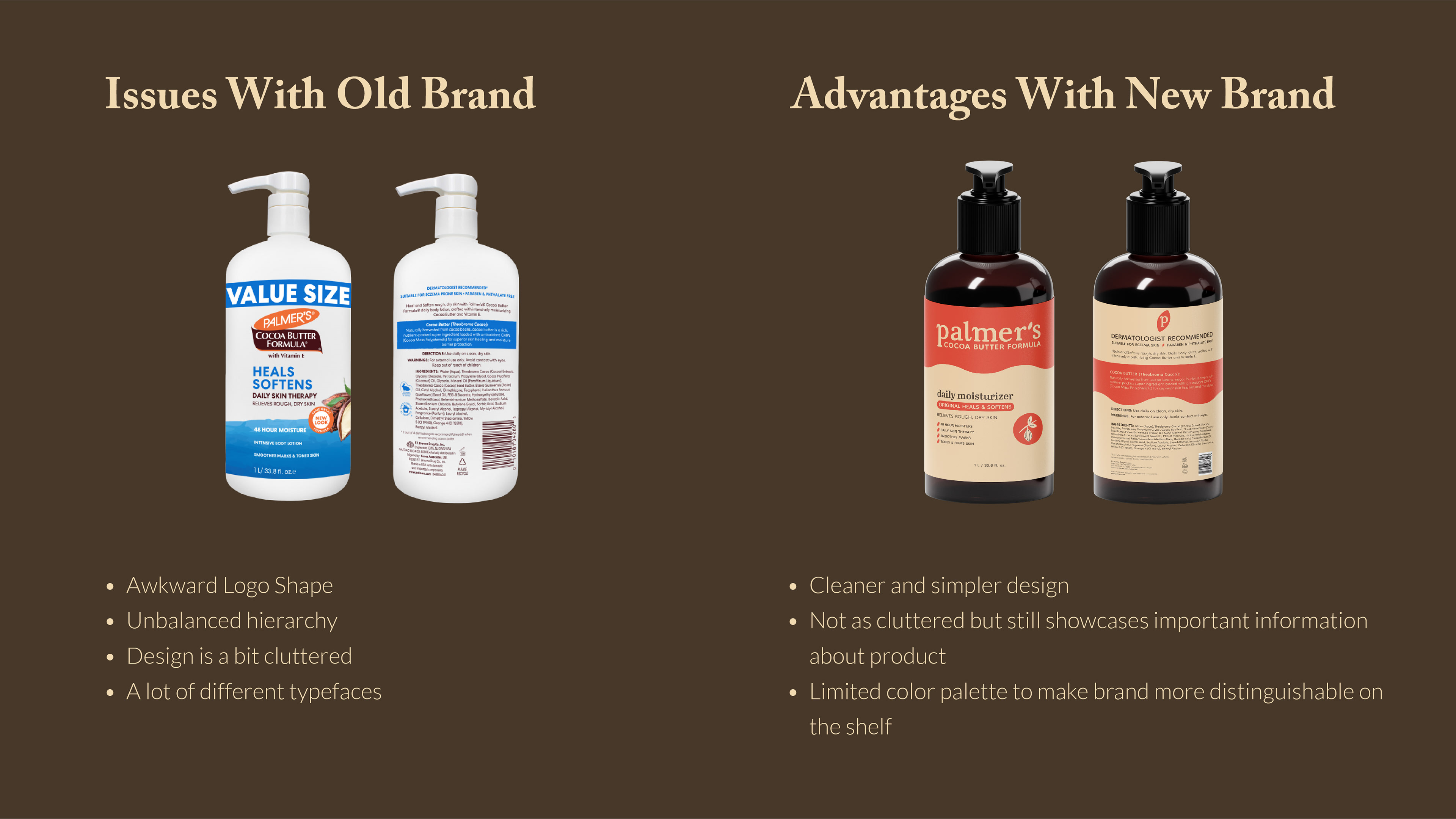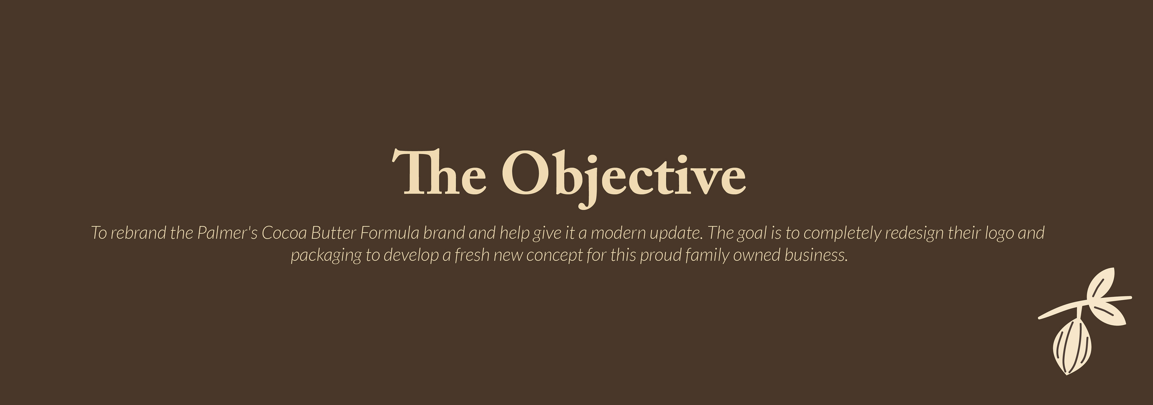 Palmer's Cocoa Butter Formula is a family-owned operated skin and hair brand that was founded in 1840. It is one of the longest-standing skin and hair care brands made in the USA. The purpose of this project was to take this family brand and give their branding a bit of a modern update to their logo and packaging.